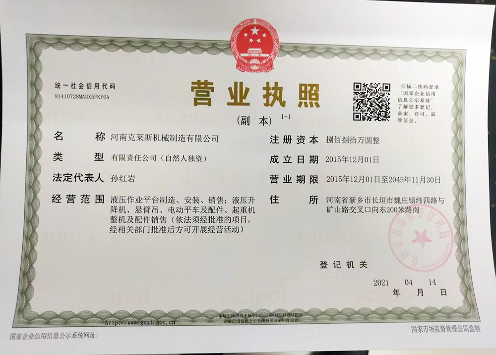 河南克萊斯機械制造有限公司位于河南省長垣市魏莊工業園區,公司注冊資金捌佰捌拾萬元整,在職員工40余名,擁有研發設計團隊,是一家生產液壓升降作業平臺及旋臂起重機生產銷售的廠家?! 」局饕a品有:固定導軌式液壓升降作業平臺、移動式液壓升降平臺、車載式液壓升降平臺;定柱式懸臂吊、墻壁吊、電動平車、登車橋等。  精良的設備,嚴格的管理是公司得以不斷發展壯大、產品能夠贏得用戶依賴的根本所在?!  熬_、...... <了解更多>